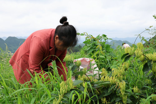 在基地务工的村民朱云惠,67岁的她干起活来一点儿不含糊,不仅自己干,还带着孙子一起。她满面红光地说道:“跟着干、勤快做,好日子不用愁!这段时间正是采摘季,干一天有150元的工资。”由于今年气候、降水等条件适宜,山银花长势喜人,一整天的辛劳变成实实在在的收入,村民们忙在地头,乐在心头,一筐筐田间地头的“致富花”承载着他们对幸福生活的美好愿景。