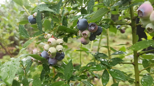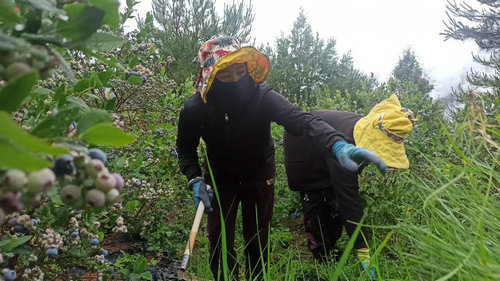 在乡城县香巴拉镇木雅通蓝莓产业园,蓝莓树成片生长,果实累累,呈现出诱人的景象。基地内工人们正忙碌着进行锄草等日常管理工作。