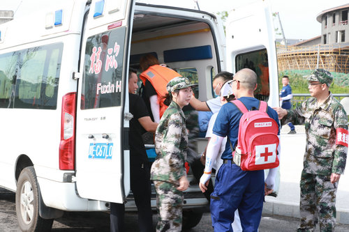 救援队三艘冲锋舟成一字形开往湖滩待转移区域,有序将灾民接上冲锋舟并到达岸边安全区,由负责安置的应急人员引导上岸,安置到救灾帐篷。其中将受伤几人进行院前急救包扎,待120车到达现场后,抬上救护车送至医院作进一步救治,进入安置区的灾民有序排队领取食物。