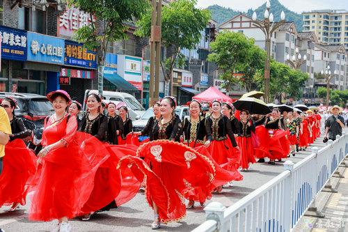 文化节在锣鼓中正式拉开序幕,苗族同胞们以拦门酒和芦笙歌舞表演欢迎来摩尼做客的领导和游客,展现欣欣向荣、团结一心谋发展的奋斗精神。紧接着,民族歌舞游行活动开始,超500位身着各民族盛装的朋友组成民族文化、民俗文化、华服文化等方阵,整齐划一,有序游行,大家身穿特色服饰,手持特色道具,充分体现了民族团结进步和中华文化自信。