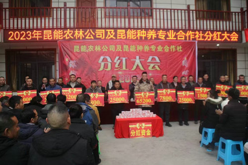 2024年1月30日,在叙永县分水镇路井村,昆能养殖专业合作社正开展分红大会,土地入股的150户农户,平均每户分到近5000元,乡亲们接过分红,乐开了花。