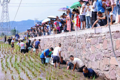节目表演结束后,趣味活动精彩上演。稻田拔河比赛、打谷子比赛、挑粮比赛、徒手捉鱼比赛等项目趣味横生,吸引了众多参与者参与比赛。参赛队员们齐心协力、奋勇拼搏、健步如飞、争分夺秒,观众们竭力呐喊、加油助威,口号声、加油声此起彼伏。趣味活动不仅考验着参赛者的力量、速度和技巧,更展现出了不屈不挠、坚持到底、勤劳勇敢的乡村本色。