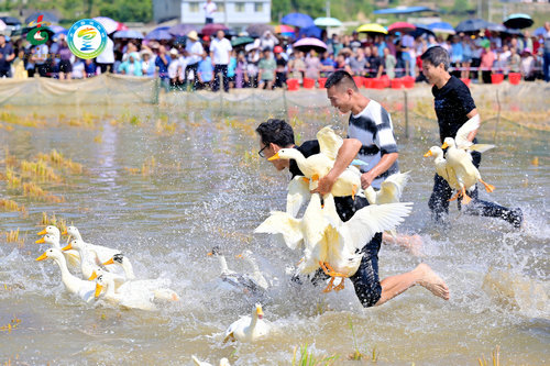 在乡村悦见丰收,禾美大道两边的稻田里,收割机轰轰作响,每一位农机手就是一位艺术家,在稻田里绘就名为“收获”的巨幅作品。现场最热闹的当属农事趣味活动了,大家在这里加油助威,欢笑声此起彼伏响彻乡村田野。割谷打谷比赛现场,来自各个村(社区)的参赛队伍,在稻田里忙得热火朝天。大家挥舞着镰刀,忙着收割、捆扎、翻打新稻,配合默契,尽情体会丰收带来的喜悦。趣味运粮比赛也在欢乐的气氛中拉开帷幕,参赛的队伍你拼我赶,将稻谷迅速装袋,合作将粮食运往终点,现场好不热闹。镜头一转,稻田捕鱼的区域更是热闹非凡。大家在稻田里小心翼翼地摸索着,寻找着那些狡猾的鱼儿。每当有人抓到一条大鱼,都会引起一阵欢呼。鱼儿在人们的手中奋力挣扎,溅起一片片水花,仿佛也在为这丰收的节日增添一份欢乐。稻田抓鸭子的场地中,村民们摩拳擦掌、跃跃欲试。一群肥硕的鸭子在稻田里惊慌失措地乱窜,选手们则如勇猛的猎人般冲进稻田。有的人轻手轻脚地靠近,准备出其不意地一把抓住;有的人则在稻田里狂奔追赶,溅起无数的泥水。鸭子的嘎嘎叫声、人们的呼喊声和欢笑声交织在一起,仿佛奏响了一曲欢快的田园交响曲。