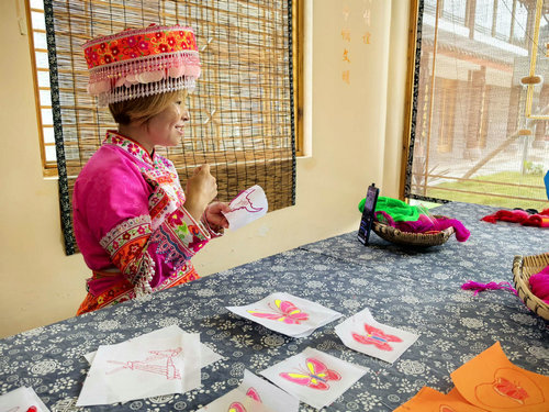如今,网络平台直播也让苗绣飞出了狭小的山村,飞向了千家万户。村民在直播间向大家展示苗绣的刺绣技法。