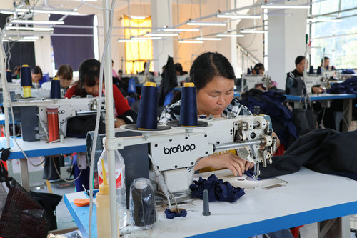 走进石宝镇可贝村的古蔺旭昇服饰制造有限公司生产车间,在机器的运作声中,30余名工人正紧张有序流水作业,缝边、压线、定位、熨烫、热压、包装……一派热火朝天的生产景象。