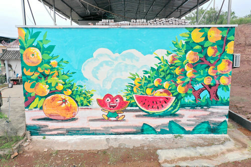 嘉明镇护松村运用“场景+创意”的方式,将当地西瓜、柑橘、稻虾等特色产业融入墙绘中,让原本一面面冰冷的围墙成为装点美丽新农村的“文化墙”“景观墙”