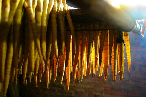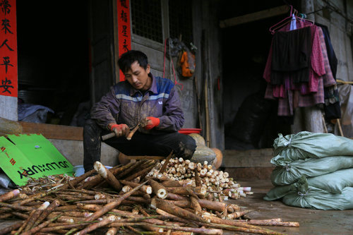秋笋素有“鲜吃方竹干吃大竹”的说法,新采回来的大竹笋,经过剥壳、煮熟、晾干、烘烤等工序,变成色泽板栗般的干笋,价格不菲。“10斤炕1斤,干笋子要卖100多元一公斤,去年我家的干笋子卖了3万多元。”竹农罗美华说。