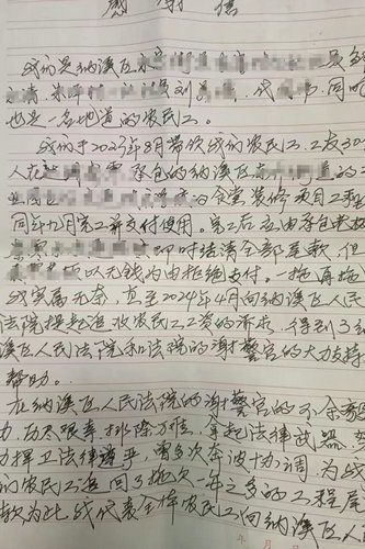 “为纳溪法院有无数为农民工办实事、办好事的人民好公仆而感到自豪!”这般情真意切的话语,源自一封手写的感谢信。这是申请执行人邹某某、代某某、刘某某赠予纳溪区法院执行局干警的特殊“谢礼”,字里行间,流露着对纳溪区法院执行工作由衷的感激与高度的赞誉。