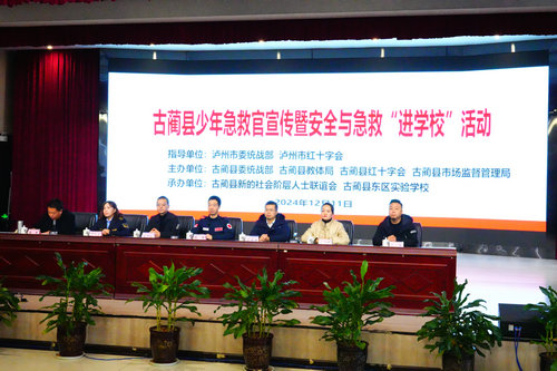 人人学急救,急救为人人。为让急救知识走进校园,进一步增强青少年儿童的安全急救意识,提升青少年儿童急救技能水平,12月11日,由古蔺县新联会联合泸州市红十字会、古蔺县委统战部、县教育体育局、县市场监管局、县红十字会共同举办的古蔺县少年急救官宣传暨安全与急救“进学校”活动成功举行。县委统战部、县教育体育局、县市场监管局、县红十字会相关负责同志,县新联会会员代表和古蔺县东区实验学校400余名师生参加活动。