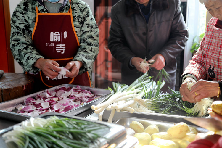 上午11点,在喻寺镇陈沱村的老年助餐点,厨师陈家平以及周边村民们正忙着洗菜、切菜,准备村民们的午餐。