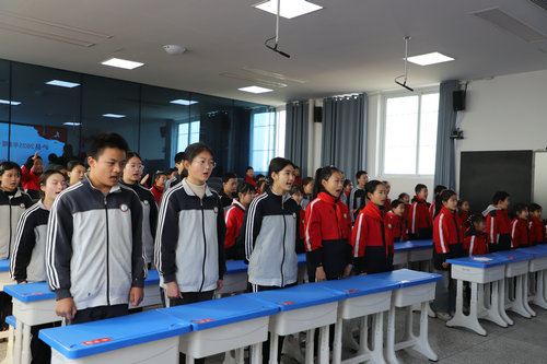 活动在庄严的国歌声中进行,学生代表为参会领导戴上鲜艳的红领巾。