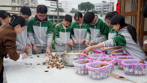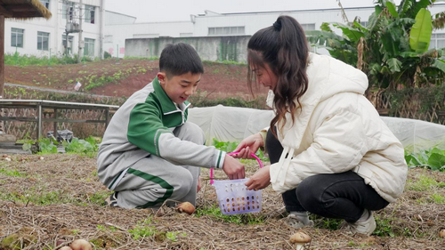 基地内,赤松茸如小伞般林立,有的圆润似珍珠,有的玲珑如纽扣。随着老师一声“动手吧”,学生们蹲下来,轻拨稻草,小心翼翼地采下一朵朵蘑菇。八年级的程军浩同学感慨:“一菇一世界,劳动中藏着大自然的智慧!”