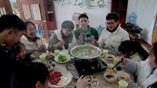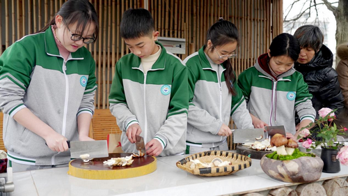采摘完毕,学生们转战“思源堂”露天厨房。清洗蘑菇时,有同学用冬寒菜叶轻拭菌褶淤泥,有人尝试丝瓜瓤摩擦去污,笑声此起彼伏。“火候要稳,松茸鸡汤才能鲜而不腻!”在老师和家长的指导下,学生们分工协作:切片、备料、热油、翻炒……素炒松茸的清香、松茸炒肉的浓郁、鸡汤的醇厚渐次弥漫。