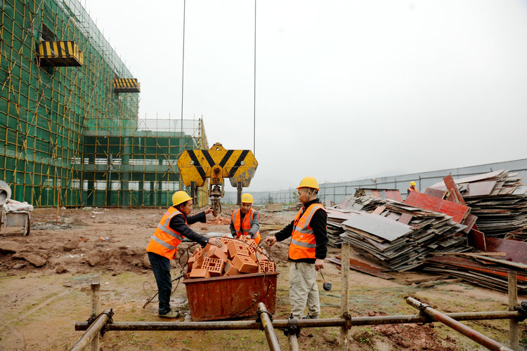 在泸州合成液压件有限公司二期项目建设现场,机械轰鸣,施工人员正忙着吊装材料、砌砖、绑扎钢筋,随处可见一片繁忙的建设景象。