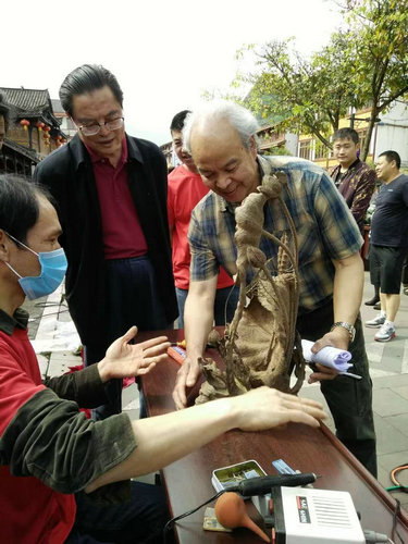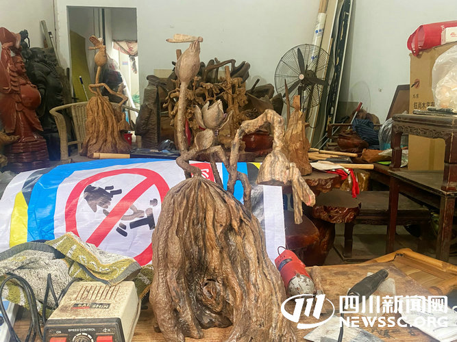 2024年,郭纯斌选用珍贵的金丝楠乌木雕刻一幅以“合江荔枝”为主题的根雕作品,在创作即将完成时却因木料断裂而功亏一篑。“合江荔枝具备本土特色,承载着‘一骑红尘妃子笑’的历史韵味,我想要通过根雕作品将家乡风情展示出来。”郭纯斌说,每一块木料都有独特的形态和纹理,一旦找到合适的木料,自己也将重新创作这幅作品。