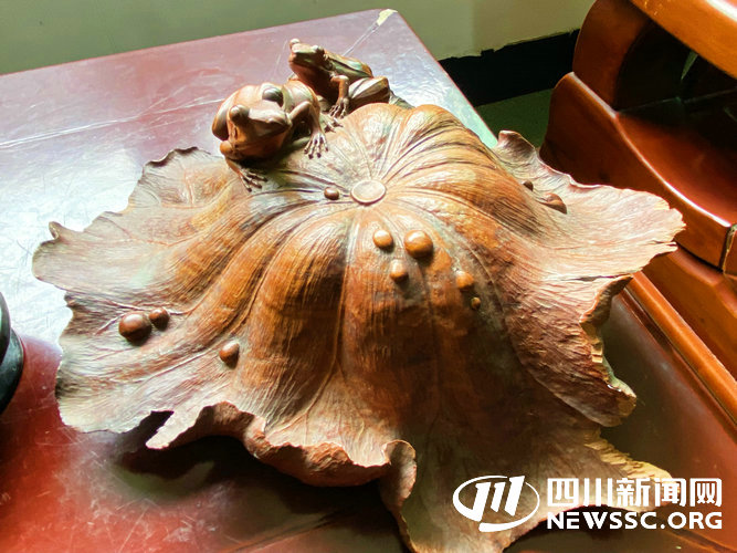 蝉在竹枝上鸣叫,竹下的嫩笋正努力破土而出;蜻蜓驻足栖息于莲蓬,荷叶上的“捉虫能手”青蛙,早已蓄势待发;百鸟之王和百花之王相互依偎,寓意着繁荣与吉祥……一件件根雕作品摆满客厅、卧室,将不足百平的小家映衬得栩栩如生。