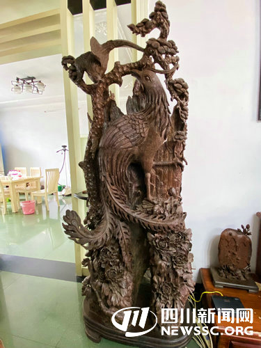 客厅显眼位置所展示的《花开富贵》,则是郭纯斌最具代表性的作品之一,牡丹花开、凤凰飞舞,每一处细节都凝聚着他的心血。2007年,郭纯斌耗费上万元购回一具重达千余斤的木料,经过长时间的阴干处理,于2012年开始创作。历经5年的精雕细琢,2017年首次成品出炉,随后又经过反复打磨,最终在2019年完成创作。