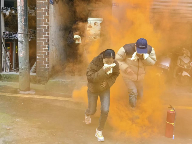 在模拟起火环节,工作人员按照计划启动应急预案,迅速响应、及时到位,各司其职,附近居民听到疏散信号后,纷纷捂住口鼻、弯腰贴墙,按照指定路线有序疏散,迅速撤离到安全地带。