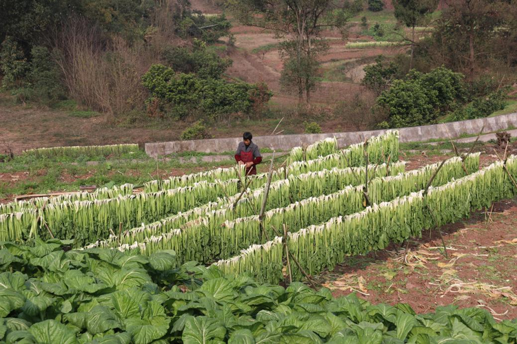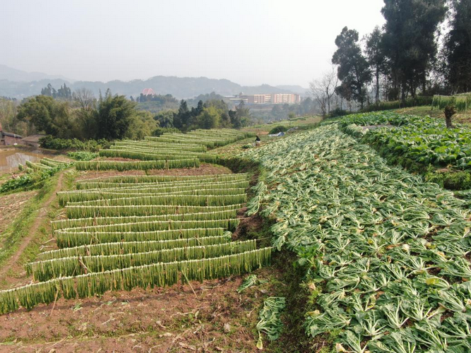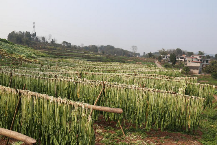 先市素有“酸菜芽菜之乡”的美誉,下坝村作为先市“芽菜”的核心产区,所种植的青菜个大饱满、品质优良。这些青菜经过晾晒和腌制加工后,将摇身一变,成为百姓餐桌上必不可少的美味——芽菜。