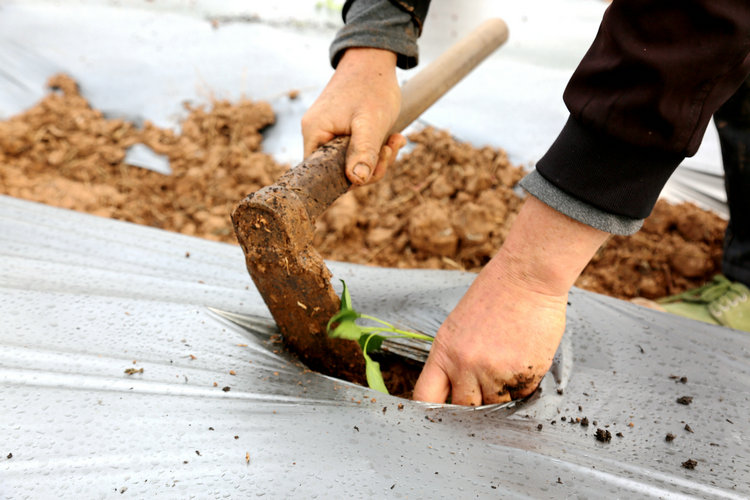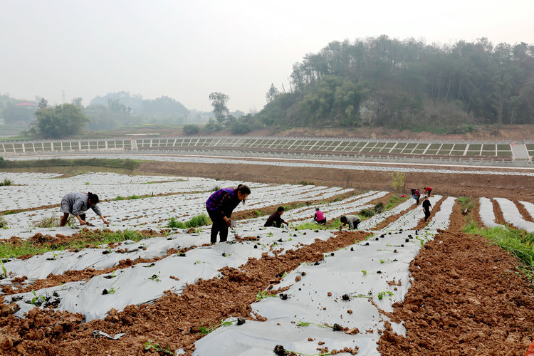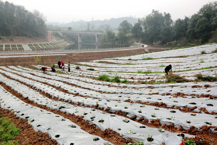 在石桥镇吉祥村的辣椒种植基地,村民们正忙着移栽辣椒苗,经过一系列运苗、破膜、栽苗、盖土、浇水后,一株株绿油油的辣椒苗整齐排列在地膜上。