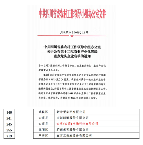 古萃生物科技获评“四川省第十二批农业产业化省级重点龙头企业”